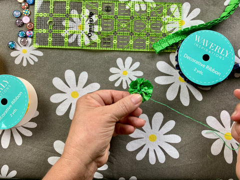 Pull the thread to gather the ribbon and sew the edges down. Just a couple stitches it all it takes.
